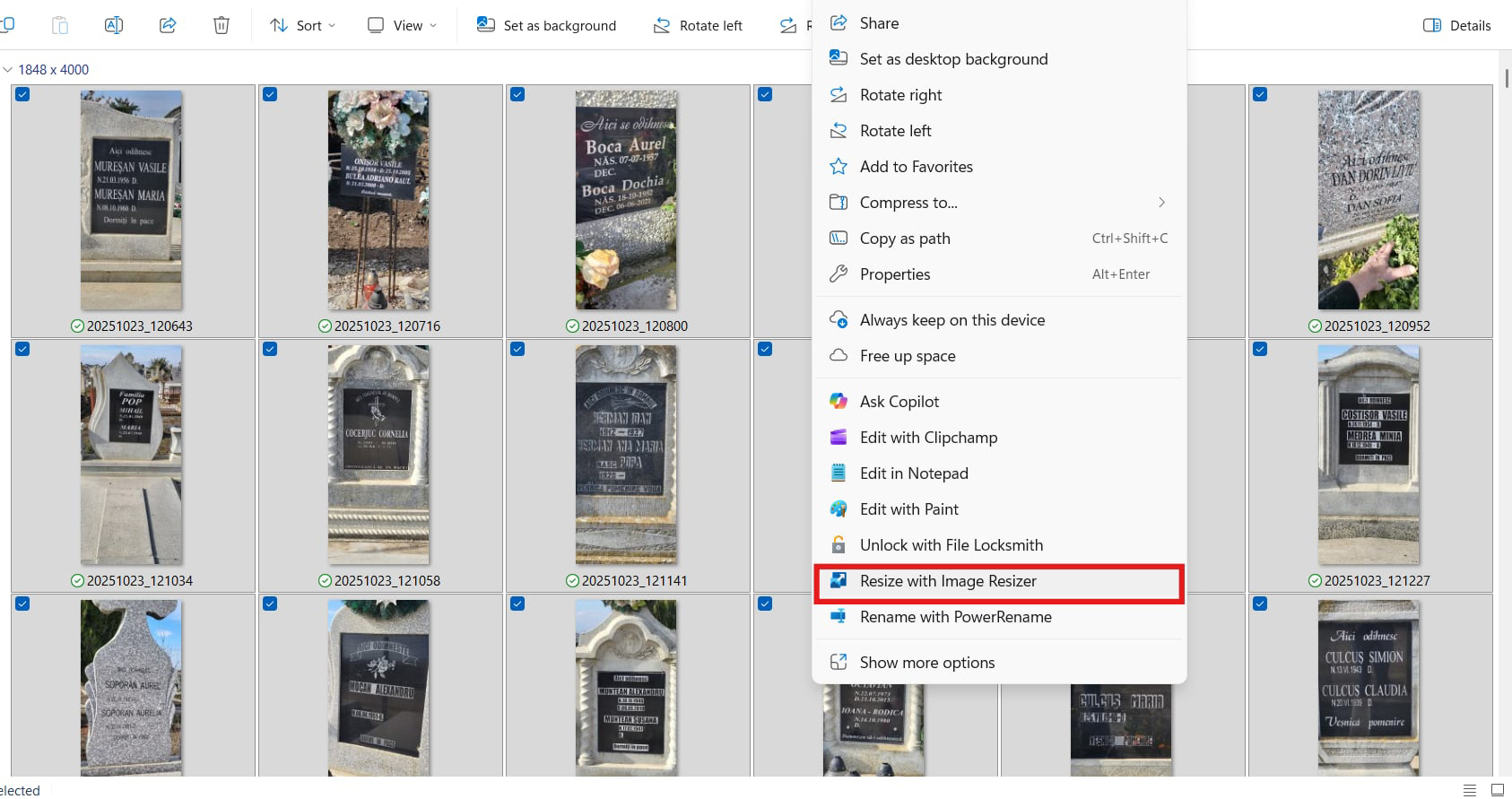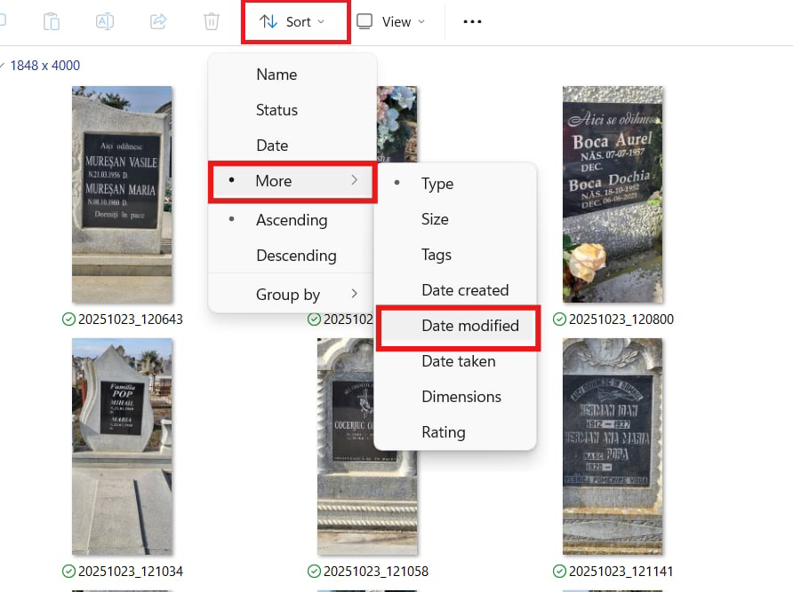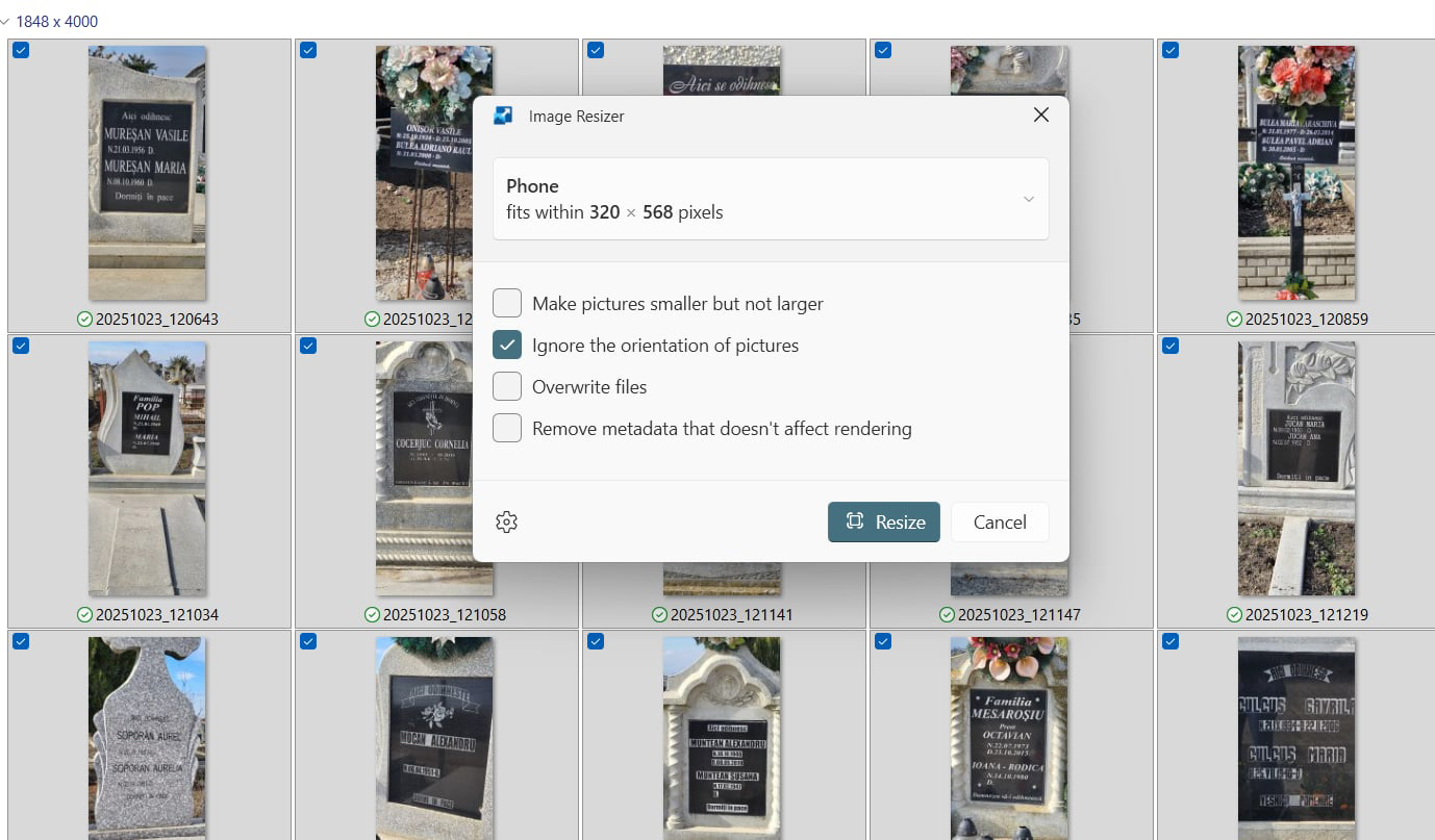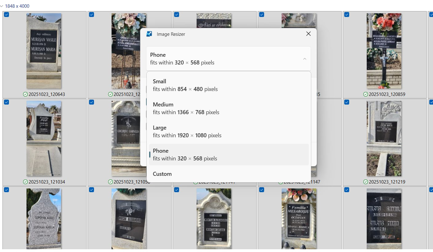 Pregătirea imaginilor pentru upload. Cu siguranță imaginile tale au undeva la 1-10Mb/imagine. Va trebui să le aduci la o mărime de 150-300kb, chiar dacă pentru aceasta vei sacrifica din calitate. În caz că nu o ai deja, instaleaza gratuit aplicația Power Toys de la Microsoft (https://learn.microsoft.com/en-us/windows/powertoys/). După instalare mergi la folderul cu imaginile tale - selectează-le pe toate – click dreapta – Resize with Image Resizer – alege una din opțiunile Small sau Phone size. Din păcate imaginile tale micșorate vor apărea în același folder cu cele mari, deci va fi nevoie să le ștergi pe cele mari înainte de a trece la pasul 6: sorteaza imaginile în baza datei modificării, șterge-le pe cele vechi (de mărime mare), păstrează-le pe cele recente (mici).